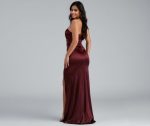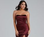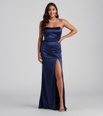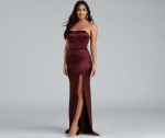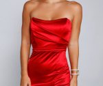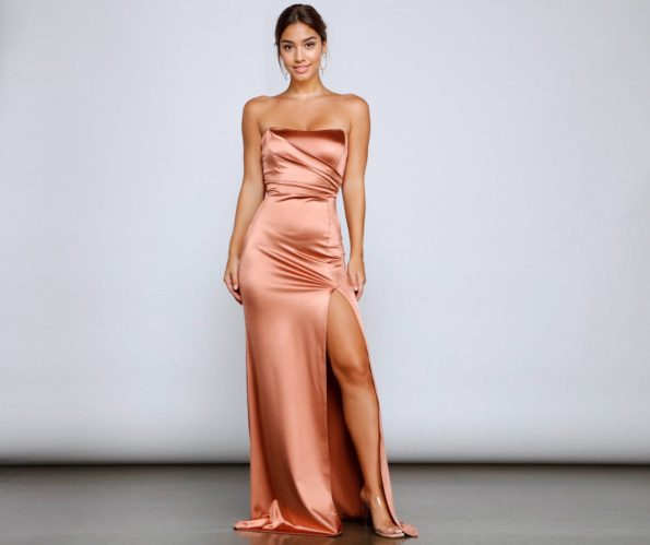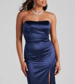 Create an effortlessly captivating look in the Gianna sleek satin formal dress. She features a strapless subtle sweetheart neckline, a wrap-front design at the bodice, a flattering high waist, and a floor-length fitted silhouette with a sultry thigh-high front slit. Complete your outfit with a and strappy heels for an unforgettable look.